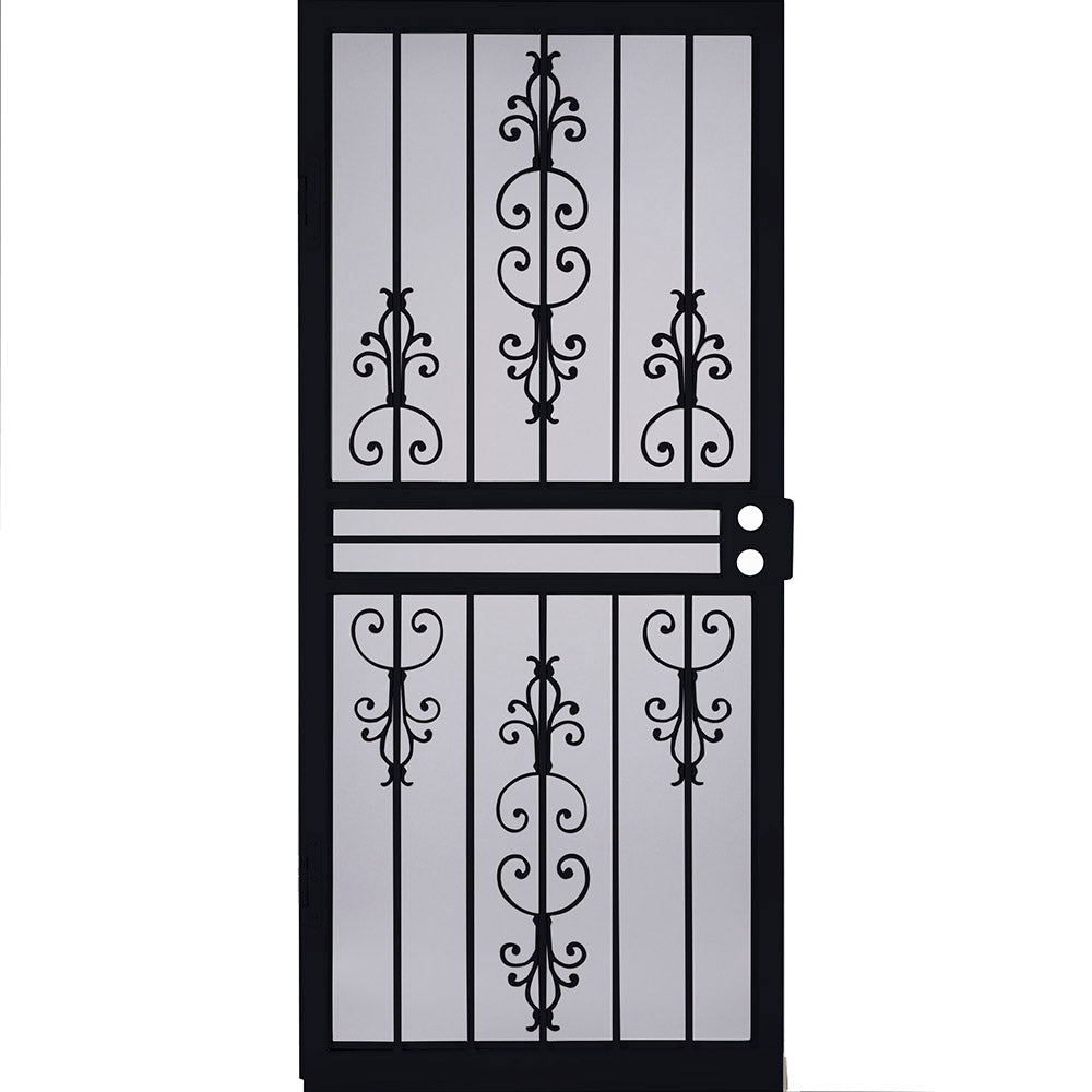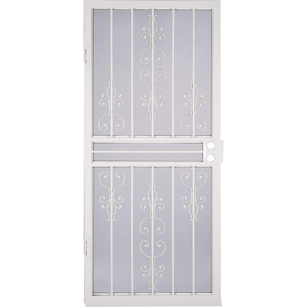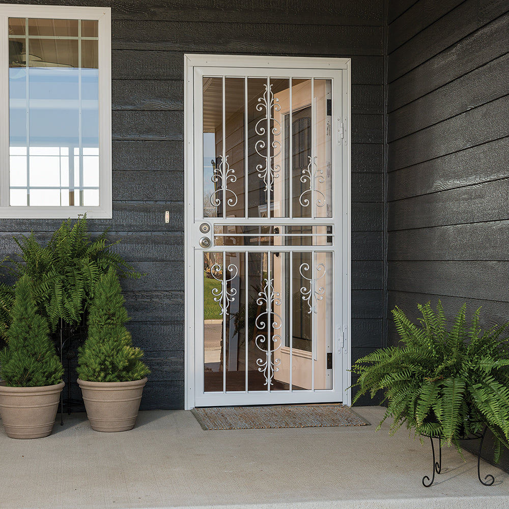 The welded tubular steel frame and three-piece tempered safety glass system provide superior strength, and the anti-removal vault pin and heavy-duty hinges add reinforced protection. Interchangeable insect screens are sold separately for seasonal venting. Heavy-duty 1-in x 2-in steel construction acts as a barrier to intruders